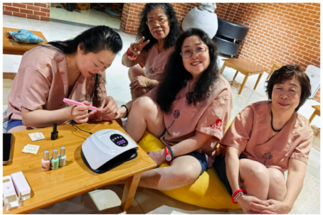 活动现场暖意融融,从细节处彰显贴心关怀。考虑到老年群体行动不便,计生协工作人员全程一对一细心陪护,从引导入座到贴心搀扶,全程细致周到。洗浴区早已备好适宜温度的热水、柔软的毛巾与温和的洗护用品,专业搓澡师傅手法轻柔,为老人们洗去一年的疲惫尘埃,让身心在暖意中得到舒缓;一旁的美妆区更是热闹温馨,美甲师耐心询问长辈们的喜好,修剪、打磨、上色一气呵成,将精致花纹与喜庆色调绽放在指尖;美睫服务则让女性长辈们双眼更显神采,在镜前看到焕新模样的她们,脸上洋溢起久违的灿烂笑容。“好久没这么细致打扮过了,这指甲做得真好看,过年走亲戚也体面!”马大姐对着指尖的红色美甲,笑意藏不住。​